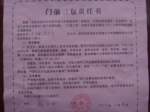 6月7日,白澤湖鄉大楓社區,進一步統一思想,提高認識,以安慶“門前三包”工作推進會為契機,立足實際,對管轄范圍內沿街商戶和小區經營戶簽訂“門前三包”責任書,簽訂率達100%,著力打造一個衛生清潔、環境秀美、文明和諧的美麗大楓社區。