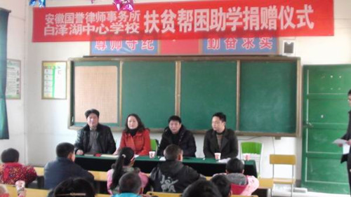 元月30日上午,由安徽國譽律師事務所與宜秀區教育局聯合開展的 “扶貧幫困,愛心助學”活動在白澤湖鄉舉行。15名家庭經濟困難的小學生每人得到了400或450元不等的現金資助。總捐助金額達6100元。