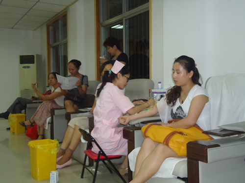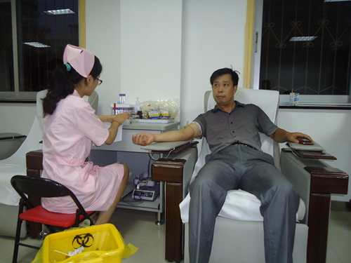 在市血站,我們看到區衛生局長張賢惜帶著從宜秀區各個醫院剛來的14位醫護人員一起進行填表、化驗。他們一邊擦著額頭上的汗水,一邊接受血站工作人員的檢查和詢問。張賢惜不是0型血,但是他也伸出了胳膊。他笑著說:“平時忙工作沒有時間來獻血,今天正好來獻出一份愛心。”