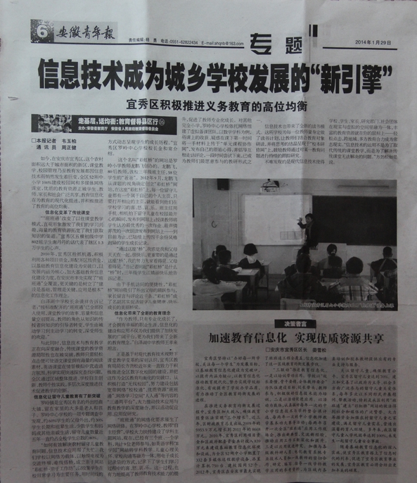 1月29日,《安徽青年報(bào)》以“信息技術(shù)成為城鄉(xiāng)學(xué)校發(fā)展的‘新引擎’”為題,用大幅版面宣傳報(bào)導(dǎo)了我區(qū)教育信息化迅猛發(fā)展成果。文章認(rèn)為,宜秀區(qū)通過(guò)大力推行教育信息化建設(shè),變革了傳統(tǒng)課堂;讓留守兒童教育有了新突破;帶來(lái)了全新的教育理念,積極推進(jìn)了義務(wù)教育的高位均衡,得到了學(xué)生、教師、家長(zhǎng)和社會(huì)的廣泛認(rèn)可。