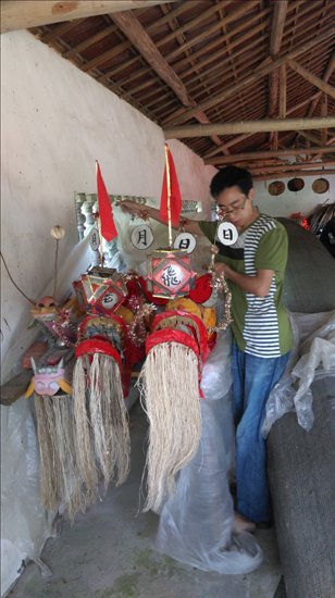 鐵閘門拉開,一條據說擁有幾百年歷史的“老龍船”更加清楚的呈現在眼前,船體是黑色的,幾乎看不到木頭的紋理,大約七八米長,全船能坐22個人。“這條船跟現在的龍舟比起來算小的,但意義不同,這是我們村子里世世代代的寶貝。老龍船究竟有多少年的歷史誰也說不清,只記得在我很小的時候,爺爺跟我說過他爺爺劃船的故事,這樣推算起來至少也有三百年的歷史了。”朱永福說,姥山村青年組早年叫做朱家咀,這個地方的人都姓朱,因此老龍船也叫朱家船,朱永福的爺爺曾經是朱家咀最有名氣的劃手。每次出水前,所有的劃手都穿著金黃色的衣服,船體的裝飾也是金黃色的,老龍船后來得名“老黃龍”,一直到現在村里人都這么叫它。