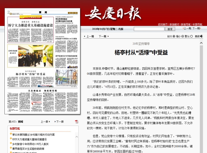 [安慶日報] 20年堅持增綠 楊亭村從“活綠”中受益