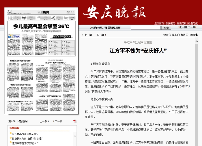 今年50歲的江方平,家住宜秀區(qū)楊橋鎮(zhèn)宣店社區(qū),是一名普通的農(nóng)民工。他上有八十多歲的老父母,下有正在讀初中的14歲的兒子,妻子在生下兒子后就患上了小腦萎縮,被鑒定為重度殘疾。十年來,江方平一邊要打工養(yǎng)家糊口,一邊還要照顧父母親、重病的妻子和年幼的兒子,任勞任怨,從來沒想過放棄。他也因此獲得了2018年3月份“安慶好人”稱號。
