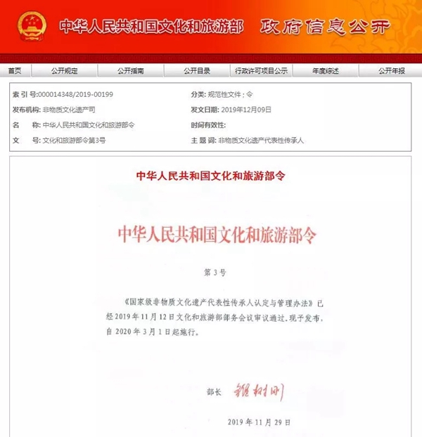 新華網(wǎng)北京12月11日電 據(jù)文化和旅游部官方網(wǎng)站消息,文化和旅游部近日發(fā)布《國家級(jí)非物質(zhì)文化遺產(chǎn)代表性傳承人認(rèn)定與管理辦法》(以下稱《辦法》),將于2020年3月1日起施行。