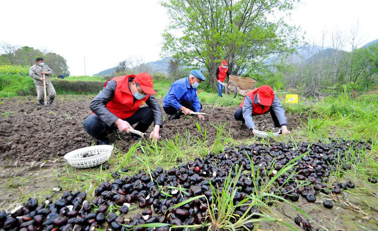(脫貧攻堅志愿隊伍在建檔立卡貧困戶江成林家的荸薺地開展志愿服務,幫助挖荸薺,版主他解決銷售難題)