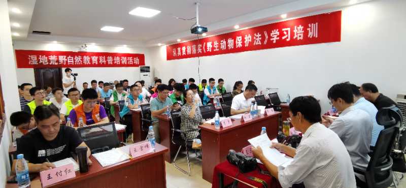 7月28日上午,由安慶菜子湖國家濕地公園保護中心主辦、安慶市菜子湖濕地生態保護協會協辦的“濕地荒野自然教育培訓班”在科普宣教中心開班。濕地公園管理人員、技術人員,保護協會巡護員、會員代表,安慶一中學生志愿者及社會公眾代表六十余人參訓。宜秀區政府副區長王曉峰到場指導,宜秀區林業局、宜秀區科協負責同志受邀參加。