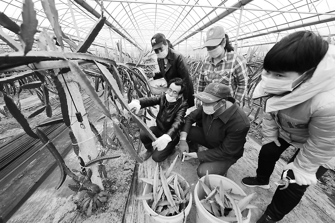 4月11日,安慶市宜秀區五橫鄉白林村農技員在龍云生態產業扶貧基地向農戶傳授火龍果修剪枝條技術。近年來,宜秀區大力發展“一鎮一園”經濟,通過“企業+基地+貧困戶”產業扶貧模式,實施精準扶貧,以土地流轉和務工的方式帶動貧困戶就業。本報記者 洪放 黃連廣 攝