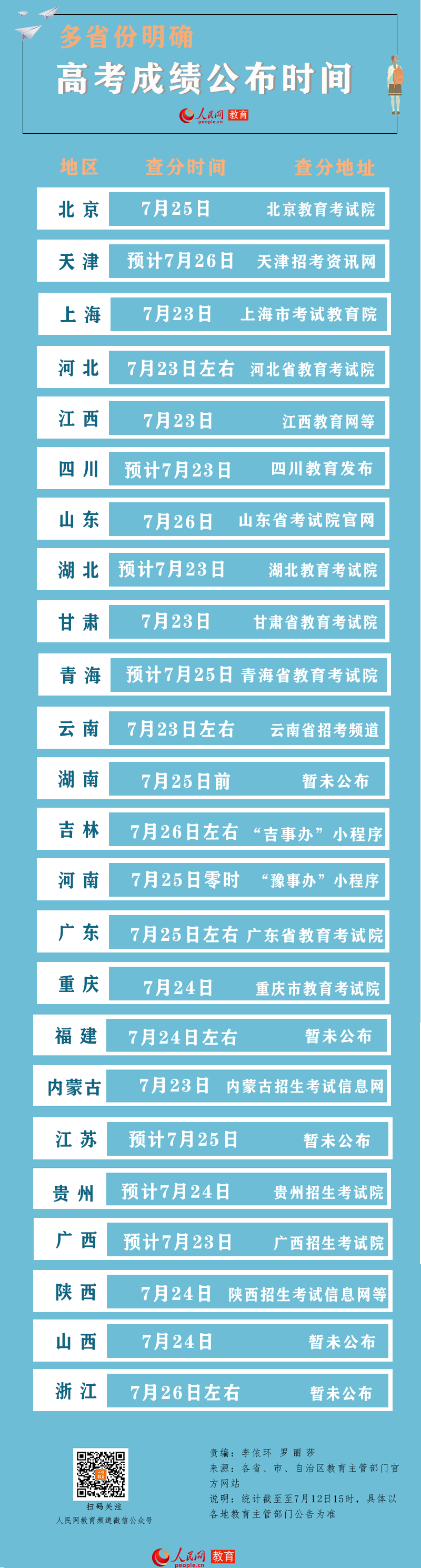 人民網北京7月12日電(李依環 實習生羅麗莎)2020年全國高考已落下帷幕,各地也陸續公布了高考成績查詢時間。人民網教育頻道梳理了多地的查分時間及查分方式,以期對考生有所參考。