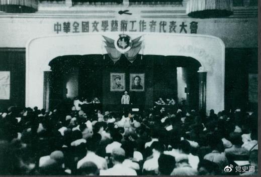 7月2日 第一次中華全國文學藝術工作者代表大會在北平開幕,19日閉幕。朱德總司令代表中共中央致詞,號召全國的文學藝術工作者團結起來,加強工作,迎接人民民主專政的新時代。與會的文藝界人士在文藝思想、文藝方向上形成共識,把毛澤東《在延安文藝座談會上的講話》提出的“文藝為人民服務、首先是為工農兵服務”的方針,確定為今后全國文藝運動的總方向;提出面向人民革命勝利的新的現實,為建設新中國的人民文藝而奮斗的任務。大會成立了中華全國文學藝術界聯合會全國委員會(簡稱全國文聯)及下屬各類文藝協會,擔負起指導和推進人民文藝事業發展的任務。