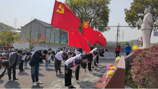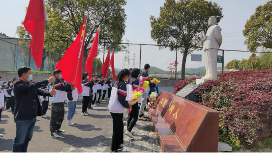清明時節(jié),杜鵑花紅,松柏流翠。4月2日上午,五橫初中全體黨員、共青團(tuán)員和少先隊(duì)員們齊聚在校園廣場的鄧稼先漢白玉雕像前,隆重舉行紀(jì)念鄧稼先活動。隨著悠揚(yáng)的獻(xiàn)花曲聲響起,師生們向這位為中國核武器的研發(fā)做出了重要貢獻(xiàn)的兩彈元勛三鞠躬,六名優(yōu)秀共青團(tuán)員向雕像獻(xiàn)上鮮花。