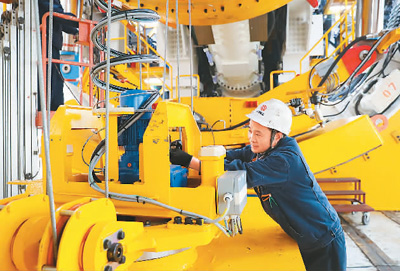11月27日,山東省首臺9米級盾構機“齊魯號”在濟南重工集團有限公司下線。這是山東省目前生產制造規格最大的盾構機,將用于粵港澳大灣區城際軌道項目建設。圖為工作人員在對“齊魯號”盾構機進行調試。