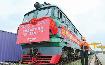圖為2022年江西首列中俄雙向?qū)﹂_班列(南昌—莫斯科)在南昌向塘國際陸港準(zhǔn)備出發(fā)。