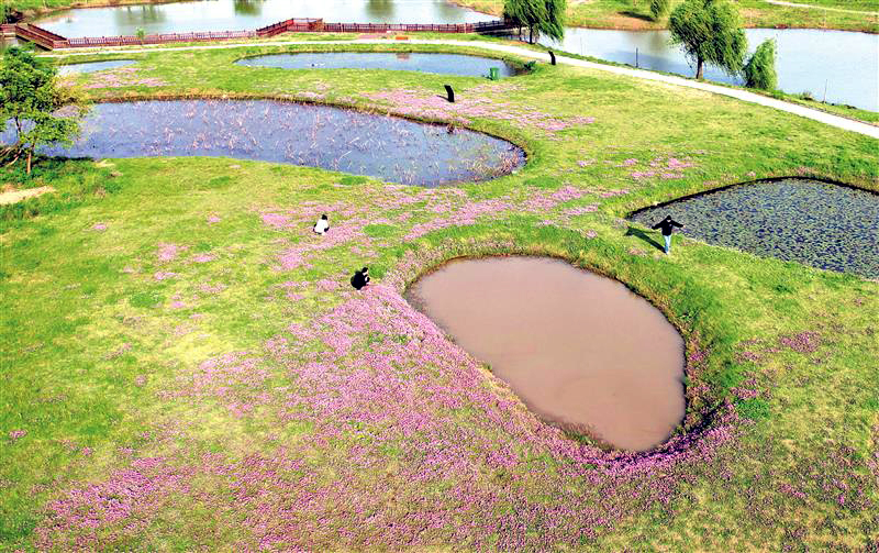 4月9日,宜秀區羅嶺鎮菜子湖國家濕地公園內,大片紫云英迎春綻放,美麗的花海吸引了市民和游客前來賞花踏春、打卡拍照。近年來,安慶市加大濕地保護修復力度,生物多樣性明顯改善,呈現出一幅幅美麗的生態文明新畫卷。