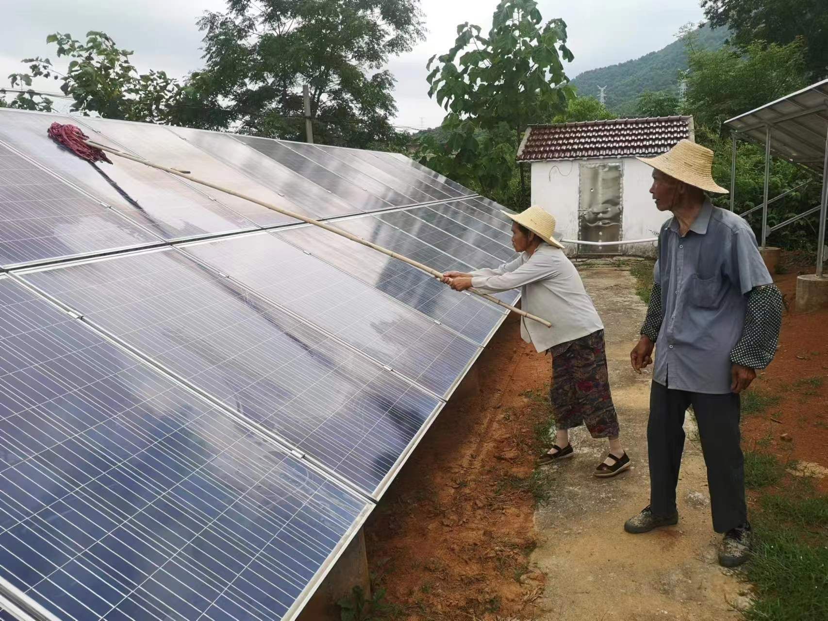 “現在氣溫高,這個面板上的灰塵、鳥糞如果不及時清洗就會干得很快,很難再清洗,所以要定期清洗,保持這個面板上的干凈,這樣才能多發電,收益才會高。而且,通過清洗面板每年還可以有2000多元的收入,在照顧家庭的同時,還可以掙錢,日子越過越好,越來越有奔頭。”白林村脫貧戶楊馬蘭開心地說道。