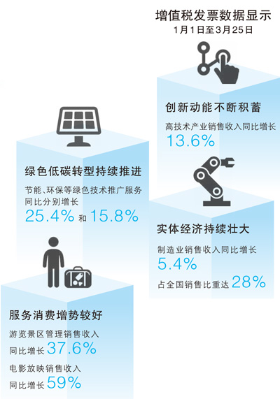 稅收數據是重要的經濟數據,能直接反映經濟運行情況。“增值稅發票數據顯示,今年1月1日至3月25日,我國經濟運行呈現多方面亮點,高質量發展取得明顯成效。”在4月1日舉行的新聞發布會上,國家稅務總局副局長王道樹說。