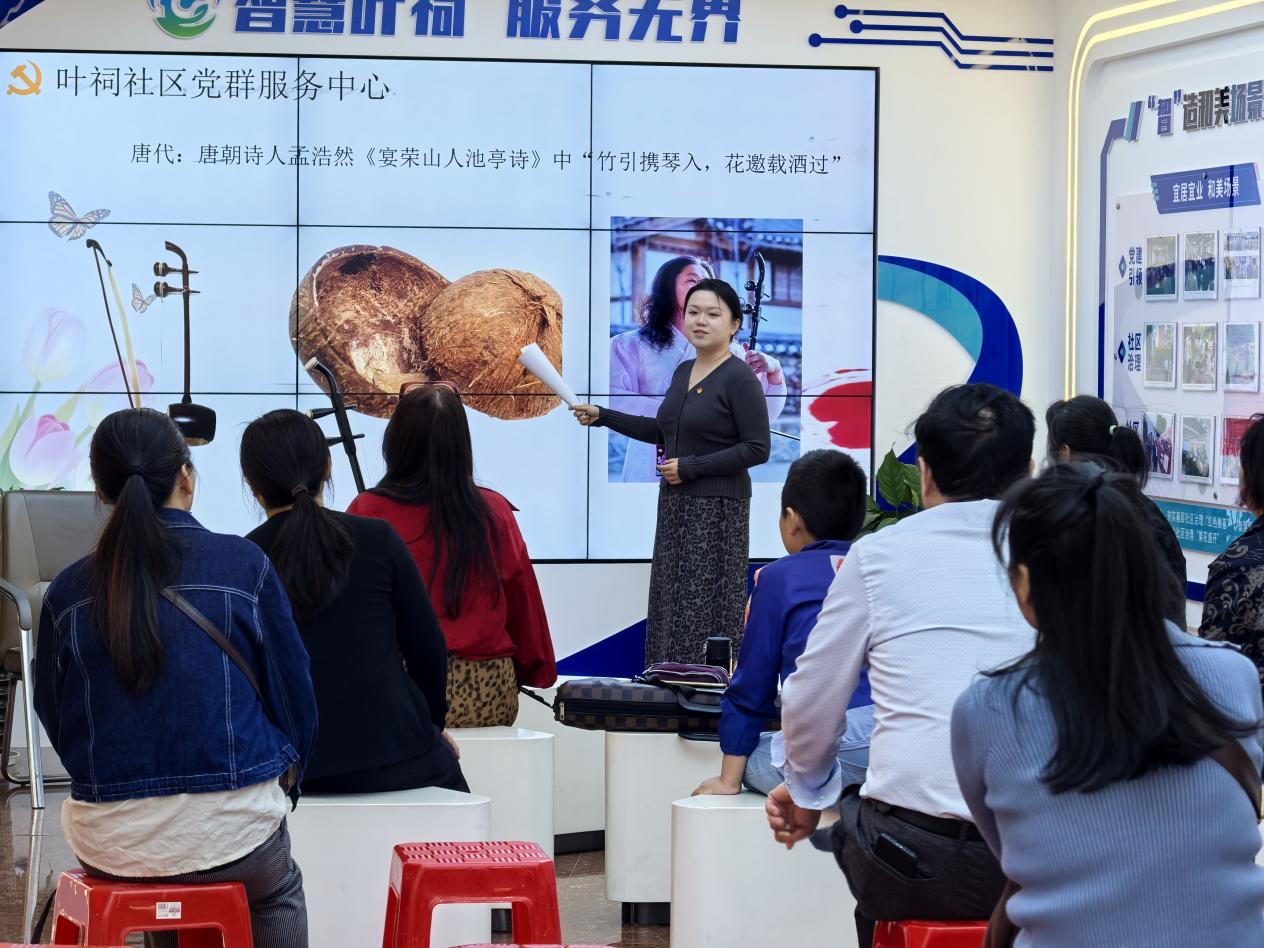 活動開始,陳沖老師作為主講人,為居民們深入淺出地講授了民樂的發展演變史。從唐代孟浩然《宴榮山人池亭詩》中的“竹引攜琴入,花邀載酒過”,再到沈括《補筆談・樂律》中記載的宮宴上徐衍奏嵇琴的軼事,陳老師用生動的講解帶領大家穿越時空,領略了民樂的悠久歷史與深厚文化底蘊。同時通過多樣的圖片展示和講解,讓居民們對二胡家族的演變和二胡藝術名家事跡有了更直觀的認識,引得現場掌聲陣陣。在理論講解之后,陳老師為大家傾情演奏了經典曲目《女兒情》和《紅塵客棧》,琴聲時而婉轉如訴,時而激昂高亢,在會場中久久回蕩,動人的旋律讓居民們在音樂中感受到情感的共鳴。